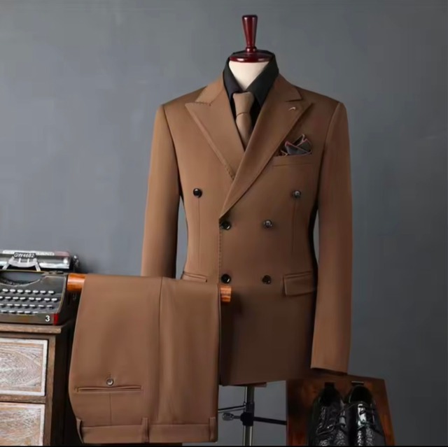 3ピース 変形デザイン ブラウン ダブルスーツ セットアップ 茶 成人式