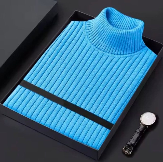伸縮性抜群 リブ編み タートルネック ニット セーター 水色 ブルー