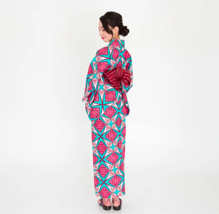 【Chérie COCO】浴衣 夢 Yume アフリカ布×和モダン(ビビッドピンク×ターコイズ幾何学柄/コットン100%)