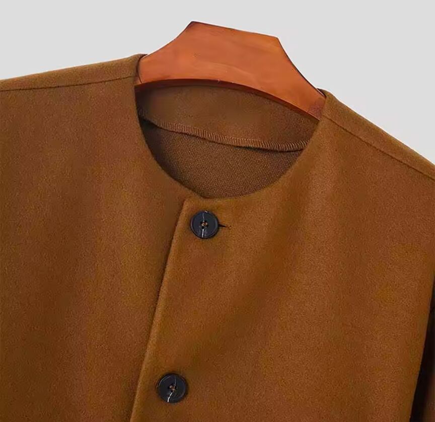 上質な雰囲気を纏う、シンプルで洗練されたノーカラージャケット。落ち着いたブラウンカラーが秋冬コーデを格上げ。丸首デザインが柔らかく、タートルネックやシャツとの相性も抜群です。