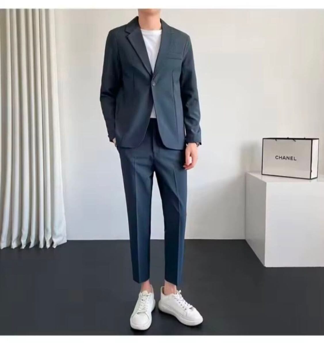 洗練された「くすみブルー」。Tシャツに羽織るだけで決まる、リラックス感と上品さを兼ね備えたカジュアルセットアップ(ジャケット・パンツ)です。
