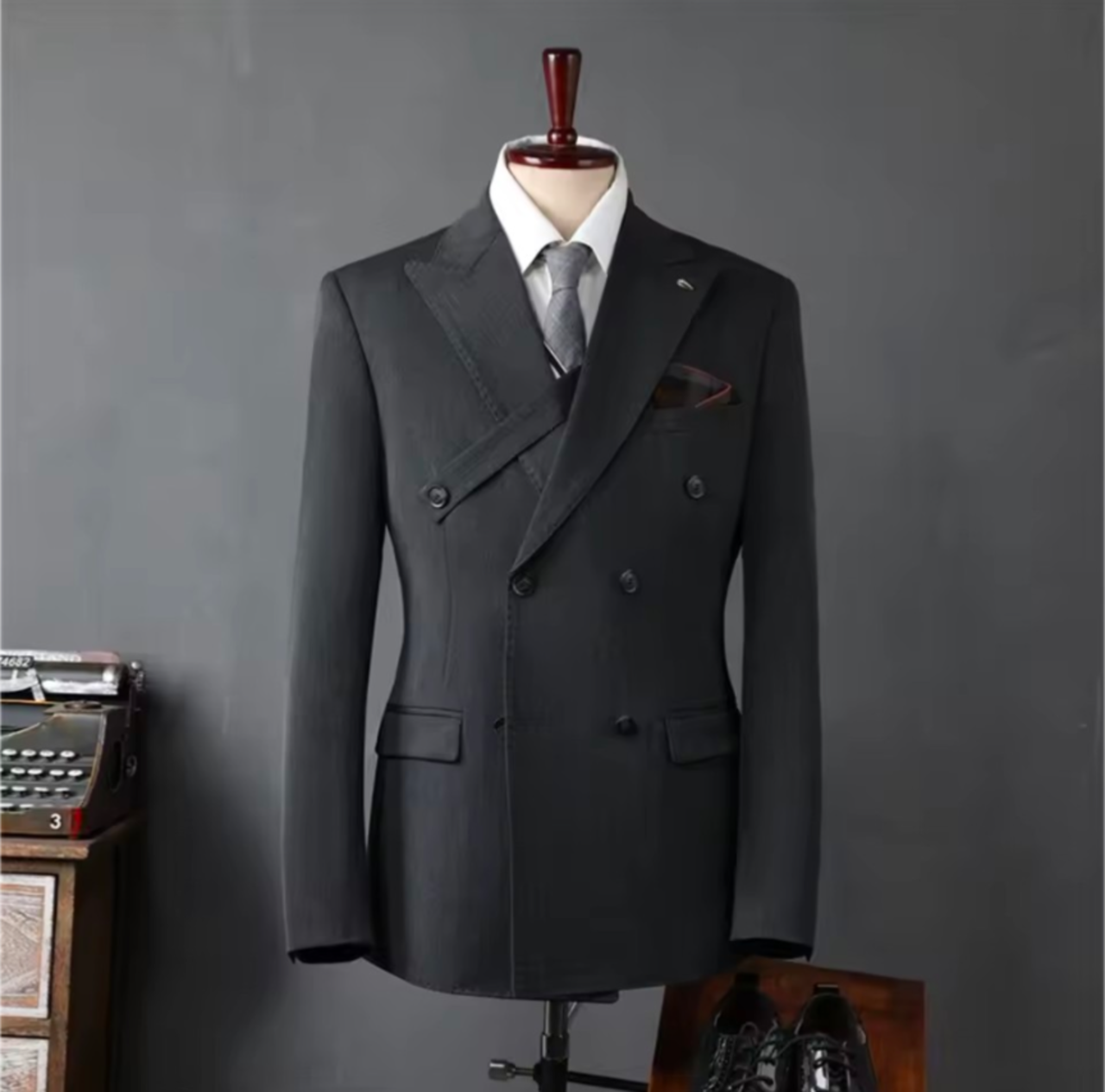変形デザイン ダークグレー ダブルスーツ セットアップ 炭黒 成人式