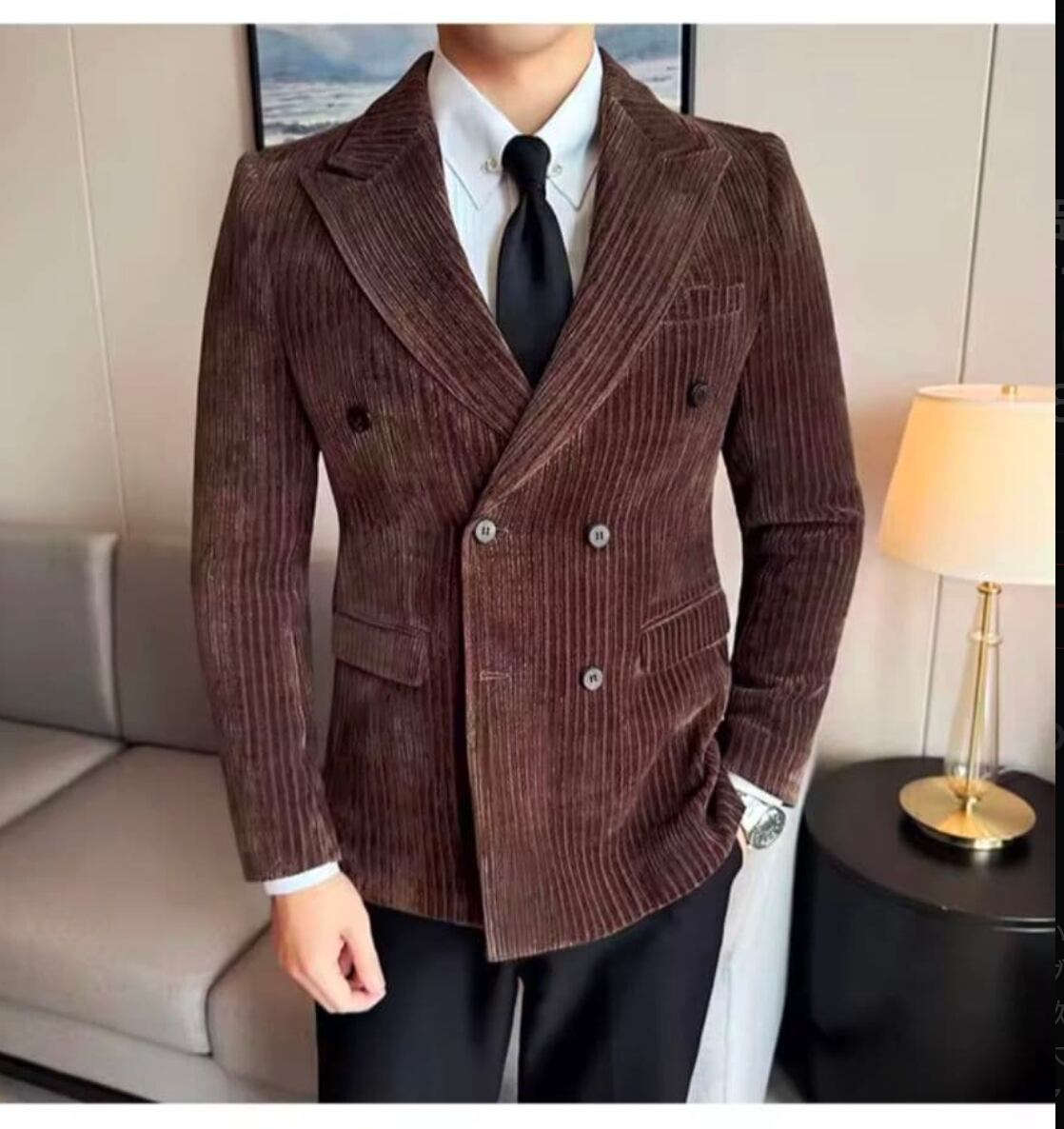太めの畝(うね)が作り出す陰影と、ベルベットのような上品な光沢感が、大人の渋さと色気を引き立てる、ラグジュアリーなダブルブレストジャケットです。