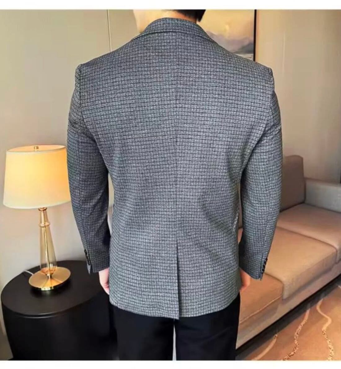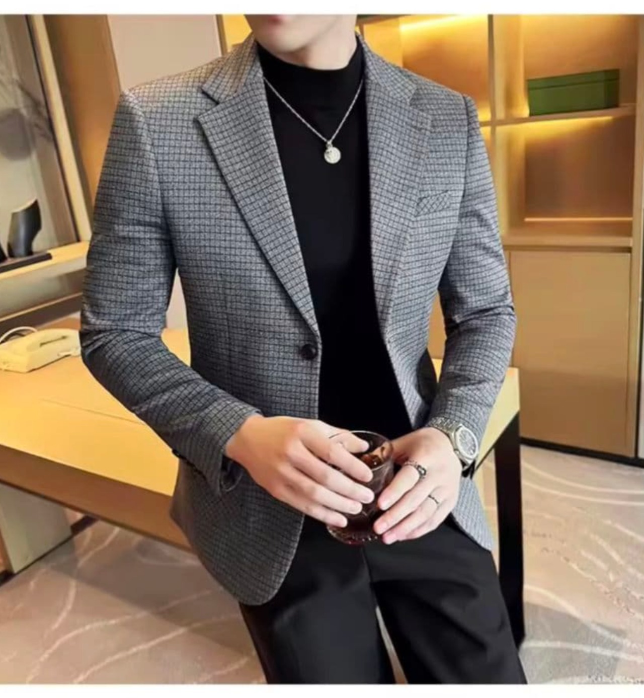 都会的でクールなグレー。シャープなグリッドチェック柄が、知性と洗練された雰囲気を演出するテーラードジャケットです。